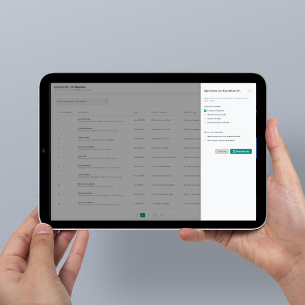 Nuestra plataforma permite una gestión integral: desde el alta de hermanos cumpliendo el RGPD hasta la generación de remesas bancarias y la organización del cortejo procesional.